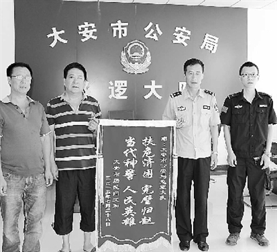 7月28日,失主的丈夫专程来到大安市公安局巡逻大队,送来一面锦旗表达谢意。