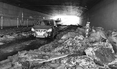 随后, 记者又来到地下通道的西侧车道,这条车道的情况与东侧车道基本差不多,唯一不同的就是西侧还留有一条略微平整的“冰路”,仅够一辆车勉强通过。记者还看到一些驶入地下通道的汽车,纷纷小心翼翼地从这里通过,稍有不慎就可能被旁边高高堆起的碎冰刮到,而且冰面上还有多道隆起的冰棱,通过的车辆稍有不慎就会侧滑。一些底盘较低的轿车通过这里更是时常传出底盘被冰棱刮擦的声音。记者在冰堆之中还看到了一些破碎的车辆保险杠碎片,显然有不少车辆在这里“受过伤”。
