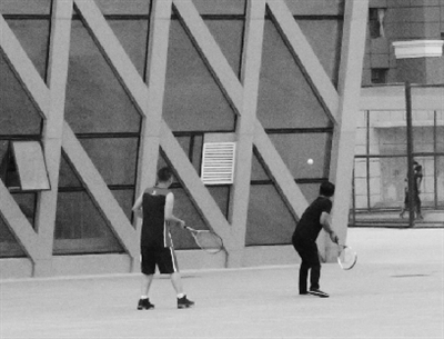 日前,在白城市全民健身中心南侧,两名青年男子利用健身中心的玻璃幕墙打网球,这种破坏公共设施的行为令人气愤。 (记者 马彬/摄)