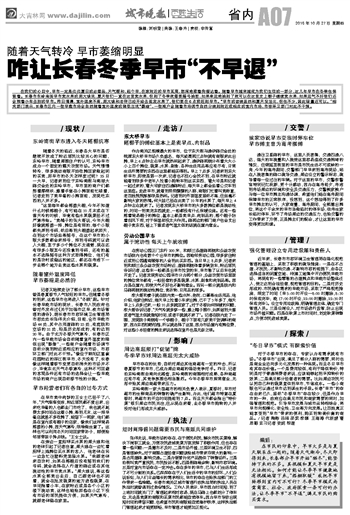 记者又陆续走访了部分早市,这些早市曾是春夏季节人气较旺的早市。但随着冬季的到来,这些早市也将进入“冬眠”期。针对长春早晚市场的现状,长春市人民政府也曾对外发布过《关于加强市区早、夜市场管理的通告》,据长春市市容环境卫生管理局市容处处长张伟光介绍,目前,全市早晚市场44处,其中占用道路的23处,有庭院和空场的21处,均是历史形成的,有的达到20年。由于北方冬季天气寒冷,长春市区内一些早晚市场会自然随着室外温度的降低出现“萎缩”,一些商户会随着市场调节自然分流到附近或相应的室内市场,市容环卫部门对此不干预。“像位于朝阳区富豪花园附近的浑江街早市,冬天没有了,长春像这样随着季节变更自然消失的市场并不少,毕竟东北天气冬季寒冷,这种不可回避的客观条件还有市场的选择会让一些早晚市场的商户出现自然季节性的分流。”