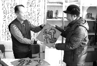 书法家们当场挥毫泼墨,笔不停歇地写就了300余幅春联和福字。居民们兴高采烈地将这些春联和福字接过来,小心翼翼地将上面的墨汁晾干。一时间,社区活动室内翰墨飘香、春意盎然。/记者 张风 报道 马彬 摄