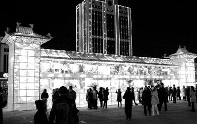 广场东侧的灯展入口处,一座气势恢宏的迎宾门高高矗立,迎宾门通体由彩灯构成,其中包括宫灯与花灯,整座门楼流光溢彩,仿佛灯海之中的一颗璀璨明珠,喻示着2017年的白城人民将打开城市之门,以广阔的胸怀、开放的姿态,笑迎八方来客、喜接四海宾朋。
