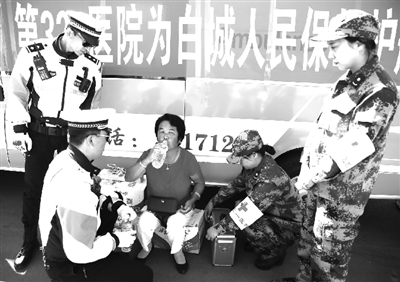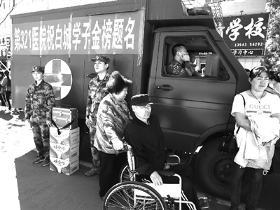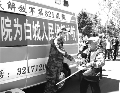 2017年高考期间,驻白解放军第321医院以为当地政府分忧、为考生及其家长保驾护航的使命担当,主动抽组12人的两支医疗队,分头在白城一中、实验高中两个规模较大的考点上,为数千名考生及其家长提供了全程免费医疗服务和健康保障。两天来,他们为出现身体症状的考生现场查体诊治,为患病的考生家长送医问诊,现场接诊40多人次,发放治疗腹泻、感冒、高血压、心脏病和预防中暑等常见急救药品达20多个品种。 7日11时45分许,一名带着厚厚近视眼镜的女生刚刚走出实验高中考场大门突然捂着眼睛蹲了下来,守护在救护车前的军医王天昊与护士陈美佳见状立即跑了过去扶住了她。原来,这名女生因视觉极度疲劳受到室外阳光强烈刺激后一时睁不开双眼,并出现眩晕症状,二人便与女孩的母亲一起将其搀扶到救护车里,为她做了眼部按摩,待其视力调节功能恢复正常后用救护车将母女俩送到市区的家里,撤收归营时已是中午12点多钟了。