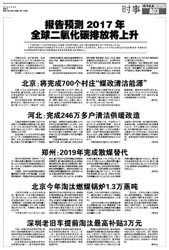 郑州市日前发布的《郑州市“十三五”煤炭消费总量控制工作实施方案》称,2019年底完成冬季清洁取暖试点任务,全市45万散煤用户全面实施电代煤、气代煤。