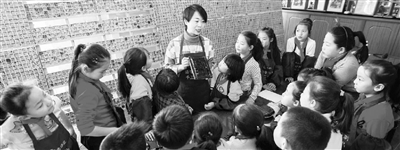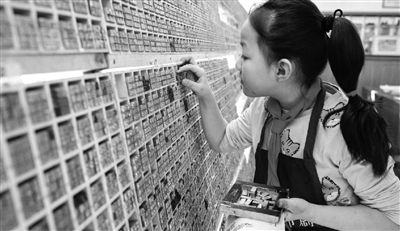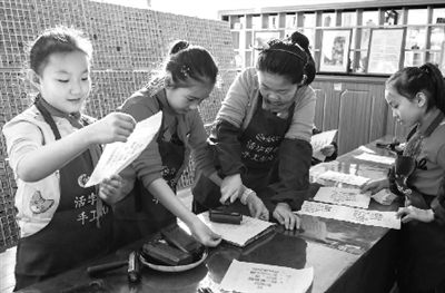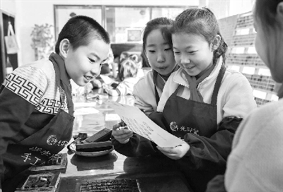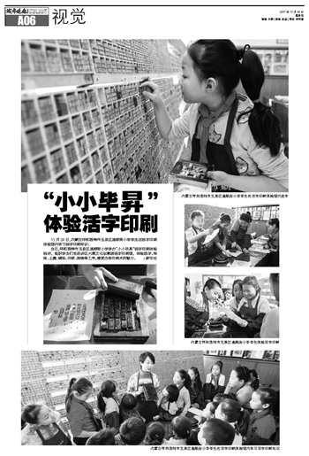 11月28日,内蒙古呼和浩特市玉泉区通顺街小学学生在活字印刷体验馆内学习活字印刷知识。