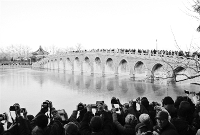 近日,游客在颐和园欣赏十七孔桥“金光穿洞”美景。