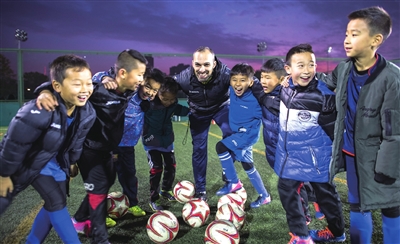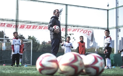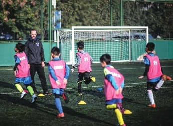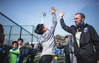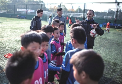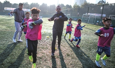 冒着初冬寒风,在一群孩子的围簇下,西班牙巴塞罗那足球学校职业教练塞尔希奥开始指导孩子们如何在快速攻防转换中,把握住自己的场上位置与作用。小球员们在这个“洋教头”的指导与陪伴中,享受着足球运动带来的快乐,感受着足球运动特有的魅力。