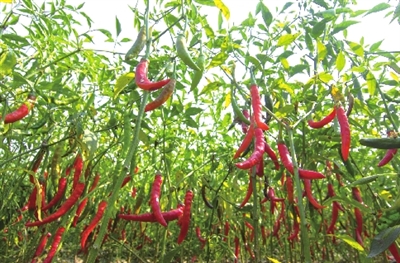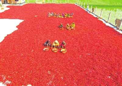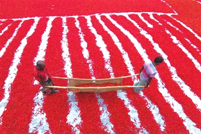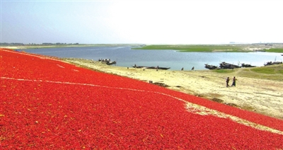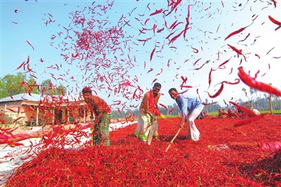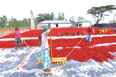 这张未标明日期的照片显示,在孟加拉国北部的博格拉地区,农民晾晒收获的红辣椒。/新华社