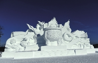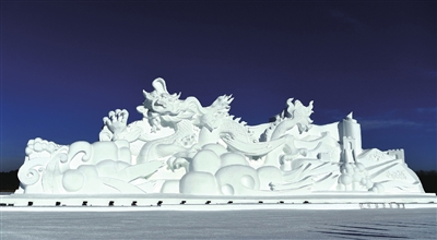 气势恢宏的主雪雕《龙腾盛世》位于第三部分腾飞新时代,造型恢弘大气、震撼人心、冲击力强。主雪雕长80米、宽20米、高30米,总用雪量为3.5万立方米,整体造型以腾飞的巨龙为主体,背景配以蜿蜒的长城,让人生发龙腾盛世,中华振兴之感,引得游客争相拍照留念。