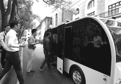 5月8日,乘客登上在上海交通大学校园内进行实验性运行的无人驾驶小巴。5月开始,由上海交通大学电子信息与电气工程学院与青飞智能联合研制的无人驾驶小巴在校园内进行实验性运行。在校园内设置的3个站点,乘车者可以扫描二维码呼叫无人小巴接载,车上的自动驾驶系统采用感知地图匹配的方法,通过激光点云对无人车进行定位和导航,不仅能自主驾驶,还能自动躲避行人。在目前实验性运行阶段,该小巴时速限定15公里,车内最多搭载8人,每日载客总数约200人次。车上配备安全员跟车,以保证安全。