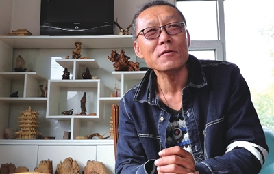 一堆木根堆满了小院,男主人戴着一副眼睛,瘦高大个,粗狂中含着文气。金秋十月,一个清朗的日子,媒体记者们带着长枪短炮“瞄”上了这个地道的东北汉子。