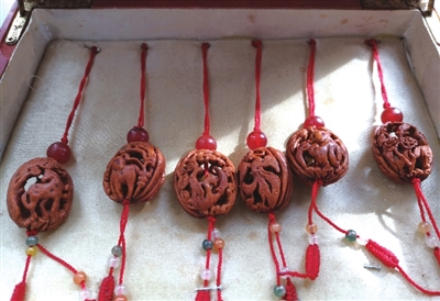 奥运福娃、十二生肖、长白虎啸、吉祥如意、还有朝鲜族题材的象帽舞、长鼓舞……阳光洒满李臣工作室,件件桃核微雕作品都凝聚着李臣的智慧和辛劳。一张又一张来自全国各地的获奖证书静静地介绍着这些核雕作者的成绩和国内一些权威艺术部门对李臣桃核微雕技艺的认可。