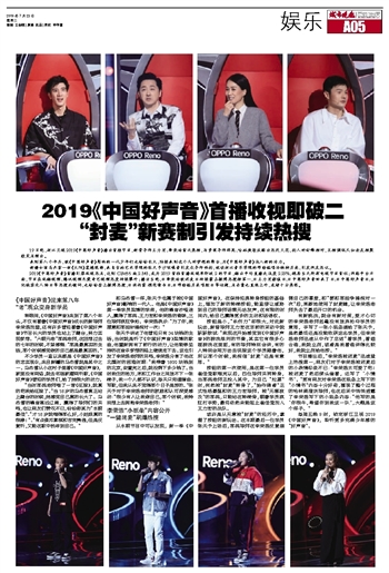 2019《中国好声音》首播引爆收视热点,达到CSM55城2.343,成为2019首档首播收视率即破2的节目,酷云平均直播关注度2.29%,稳居当天所有电视节目首位;网络平台方面,节目在优酷视频、腾讯视频及爱奇艺视频热度持续攀升;播出当晚,#李荣浩被闭麦#持续霸占微博热搜榜第一,#王力宏颜值#、#中国好声音回来了#、#中国好声音#、#纪晓君没人转#等热搜关键词,也纷纷登上微博热搜,#洪雨雷 模范情书#、#邢晗铭另类唱腔#等话题,点击量也直线上升,成绩十分亮眼。
