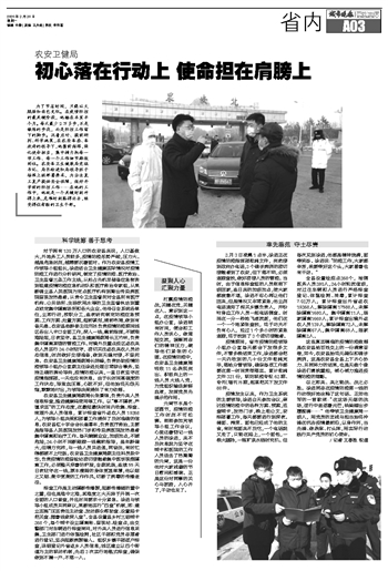 对于拥有120万人口的农安县来说,人口基数大,外地务工人员较多,疫情防控形势严峻,压力大。越是危急时刻,越需要沉着面对。作为农安县疫情工作领导小组组长,徐进结合卫生健康实际情况对疫情防控工作进行分析研判,制定了疫情防控、医疗救治、卫生监督三条工作主线,从抢占先机早储备应急物资到组建疫情防控应急机动队和医疗救治专家组,从果断确立县人民医院为定点医疗机构到腾出传染病医院留观发热患者。从责令卫生监督所对全县所有医疗机构、公共场所、生活饮用水等的卫生监督执法到重点锁定集中隔离场所和各大企业。他号召全系统各单位,立即行动,按职分工,连夜研究制定防控应急预案、工作方案、处置方案,超前谋划,提前布局,做到有备无患。农安县老龄委主任刘冰负责疫情防控期间城区各出入卡口全面工作,深入一线,靠前指挥,不顾艰难险阻,日夜坚守。县卫生健康局副局长王竹林,负责集中隔离宾馆的管控工作。对境外及重点疫区返农来农人员实行24小时驻守,密切关注返农来农人员动态信息,时刻做好交接准备,做到无缝对接,不留死角。农安县卫生健康局副局长陈峰,负责协助疫情防控领导小组办公室副主任徐进处理日常综合事务,坚持正确的舆论导向,疫情防控以来,一直日夜坚守在疫情指挥部,一天也没有休息。由于长时间高强度的工作状态,导致血压高,心脏不好,但他始终无怨无悔,默默地付出,为领导决策提供了有力依据。