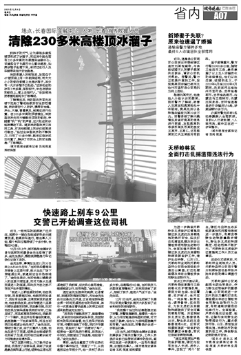 消防救援人员到场后,发现位于47楼顶端上有一处钢架结构,而大大小小的钢柱钢管上全是冰溜子,其中有一大片冰溜子已松动。“这块松动的冰有3米多高,面积较大,半包在楼体的钢柱上,看上去很吓人。”岳阳街消防救援站副站长丁思楠说。