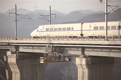 成贵高铁西溪河大桥横跨贵州省毕节市乌蒙山的西溪河大峡谷,这里山高谷深、地势险要,桥面至河面高差达250多米,冬季常有凝冻现象,寒风更是凛冽刺骨。为保障每天数十趟高铁动车组的安全通过,贵阳高铁工务段职工们克服了海拔高、气候恶劣等困难,在250多米的高空中对大桥进行体检,全力确保行车安全。/新华社