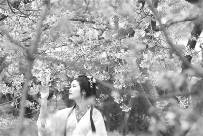 3月3日,游客身着汉服在武汉东湖樱花园内赏花留影。
