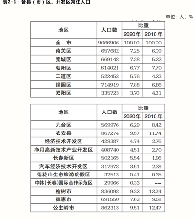 县(市)区、开发区人口情况——根据第七次全国人口普查结果,2020年11月1日零时长春市分县(市)区、开发区常住人口有关数据为: