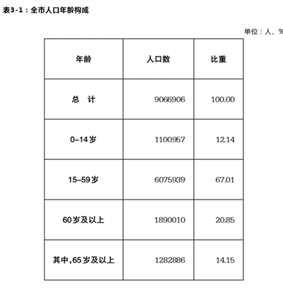 全市人口年龄构成——全市常住人口中,0-14岁人口为1100957人,占12.14%;15-59岁人口为6075939人,占67.01%;60岁及以上人口为1890010人,占20.85%,其中,65岁及以上人口为1282886人,占14.15%。与2010年第六次全国人口普查相比,0-14岁人口的比重上升了0.1个百分点,15-59岁人口的比重下降了8.23个百分点,60岁及以上人口的比重上升了8.12个百分点,65岁及以上人口的比重上升了6.07个百分点。