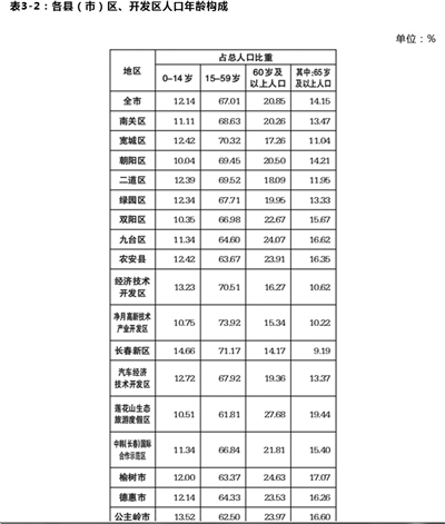 县(市)区、开发区人口年龄构成——17个县(市)区、开发区中,15-59岁人口比重在65%以上的有11个,在60%-65%之间的有6个。全市65岁及以上老年人口比重均在7%以上,17个县(市)区、开发区中,比重低于14%以下的有8个,比重超过14%的有9个。