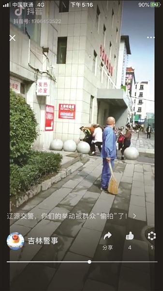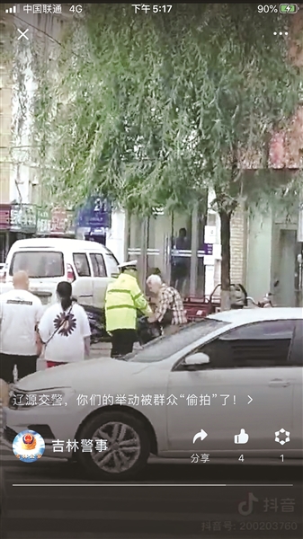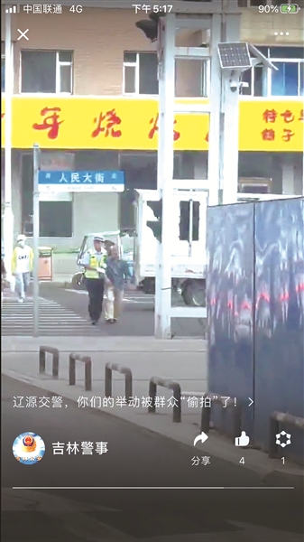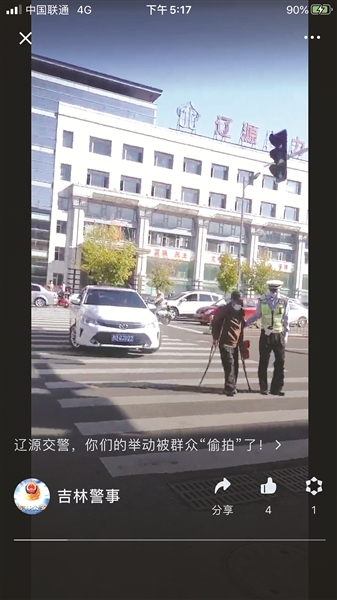 辽源市公安局交警支队龙山大队五中队辅警杨洪洋早执勤时,护送一位老人过马路。 |
