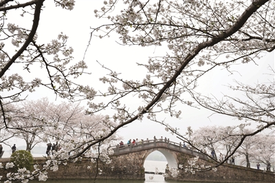3月19日,游客在江苏省无锡市太湖鼋头渚景区欣赏盛开的樱花。