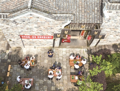 5月31日,人们在湖北省宜昌市秭归县屈原故里景区体验包粽子(无人机照片)。