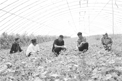 通榆县延会家庭农场现有大棚31栋,年产香瓜10万公斤,西红柿12万公斤,年销售额达到115万元,农场通过“公司+合作社+脱贫户”的模式,以用工形式安置脱贫户45人,并带动周边数十户农民致富。图为农场负责人王延会(中)在为农民讲解香瓜种植技术。 记者 张殿文 摄
