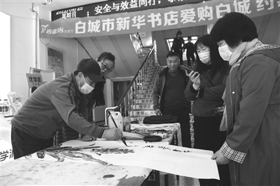 与此同时,在该书店海明路门市部老年书画园地区域,来自白城市老年书画研究会的老师们现场挥毫泼墨,以书言志,以画传情,围绕“庆国庆 喜迎二十大”主题进行创作,抒发着对党的和祖国的诚挚祝福。一幅幅苍劲有力、雄浑博大的书画作品,引起读者们的驻足赞美。活动现场,他们共为广大读者免费赠出28幅书画作品。