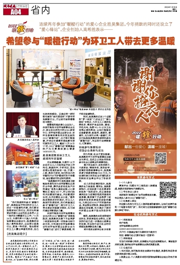 同时,胜昊集团还在3个运营的“萝卜到家”门店设立了“爱心驿站”休息区,为环卫工人提供免费热饮、微波炉食品加热、暖贴、手机充电、免费Wi-Fi以及卫生间等必要的帮助,让他们能够在这里歇歇脚、躲躲雨、避避风、暖暖手,也为城市点亮一盏暖灯,而这已经是胜昊集团连续两年参加“暖橙行动”,用实际行动奉献爱心,汇聚暖流。