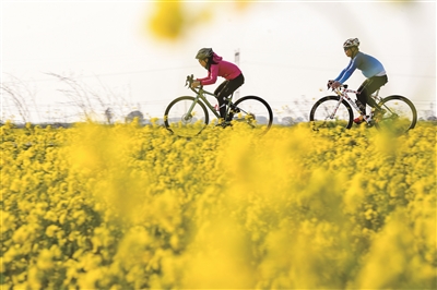 2月21日,骑行爱好者在江西省樟树市永泰镇官湖村油菜花海中骑行、赏花。随着天气回暖,江西省樟树市永泰镇官湖村的油菜花竞相绽放,金黄色花海染尽乡野,吸引了众多游人和学生等前来观赏、写生,感受春日之美。新华社发 周亮 摄