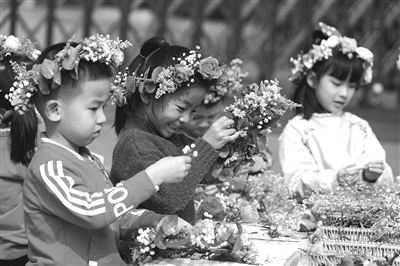 当日,重庆市北碚区缙云幼儿园开展“编花环 迎春天”手工制作活动,孩子们在老师的指导下,用枝条和鲜花编制成一顶顶多彩花环,感受春天的气息,喜迎春天的到来。新华社发 秦廷富 摄