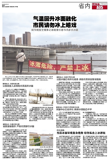 2月28日上午,长春室外气温最高5℃,湖面已清晰可见有融化的冰水。城市晚报全媒体记者在南湖公园采访时看到,仍有市民不顾危险在冰面上滑冰,而在不远处,就悬挂着“冰面危险 禁止穿行”的警示条幅。