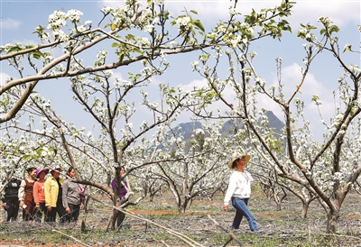 3月9日,游客在梨树林中拍摄短视频。近日,广西柳州市融安县潭头乡梨花盛开,吸引游人前来游玩拍照。 新华社记者 胡星宇 摄