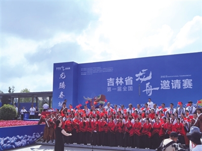 蓝天白云下,青波绿水间,当吉林省交响乐团的“民乐青年派”组合演奏的《步步高》《雨打芭蕉》《迎宾曲》等民乐经典曲目轻快悠扬地响起,吉林省第一届全国龙舟邀请赛拉开序幕。