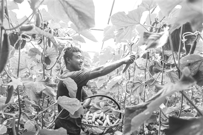 洮南市洮府街道地处市郊,利用棚膜集中开展多季种植,培育的辣椒苗、圆葱苗移栽覆盖至吉林省、辽宁省、黑龙江省及内蒙古自治区。洮府街道福胜村农民石凯,每年利用8亩地大棚进行育苗,二茬种植黄瓜、豆角、西红柿等,成熟后销往多地,获得良好的经济效益。图为石凯在采摘黄瓜。 邱会宁 范海辉 摄