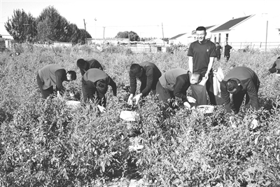 近日,吉林省森林消防总队特勤大队二中队官兵组成25人支助农秋收服务队,走进通榆县向海蒙古族乡查嘎歹村田间地头,帮助农民及时抢收辣椒,解决农民农忙,助力乡村振兴。图为官兵在采摘辣椒。 陈宝林 王旭明 摄