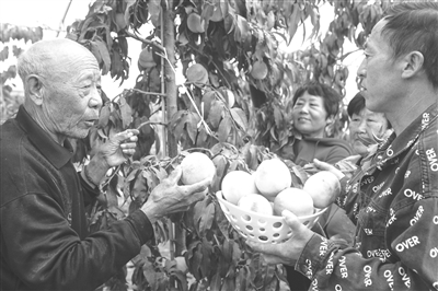 洮南市福顺镇翻身村农民黎福山有着多年的果树培育经验,他利用樱桃母本嫁接黄桃,收获的“锦绣黄桃”每个重量达半斤左右。他们还通过网络将黄桃远销福建、上海等地,广受客户好评。图为黎福山(左)正在采摘黄桃。 邱会宁 范海辉 摄