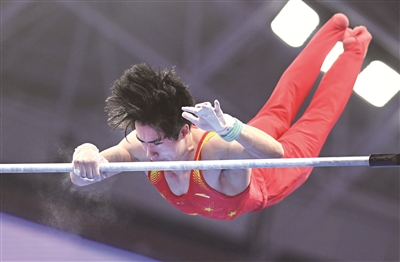 9月26日,张博恒在单杠项目比赛中。 当日,在竞技体操男子全能决赛中,中国选手张博恒以总得分89.299的成绩夺得冠军。新华社记者 程敏 摄 |