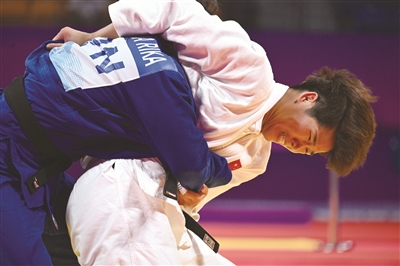 9月26日,中国选手马振昭(右)在比赛中。 当日,在柔道项目女子78公斤级决赛中,中国选手马振昭战胜日本选手高山莉加,夺得冠军。新华社记者 李安 摄 |