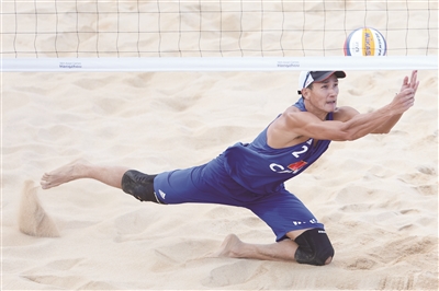 9月26日,吴佳欣在比赛中救球。 当日,在沙滩排球男子半决赛中,中国组合阿卜杜哈力克江·穆太力普/吴佳欣以2比0战胜伊朗组合阿巴斯·普拉斯加里/阿里礼萨·阿加贾尼卡萨卜,晋级决赛。新华社记者 张涛 摄 |