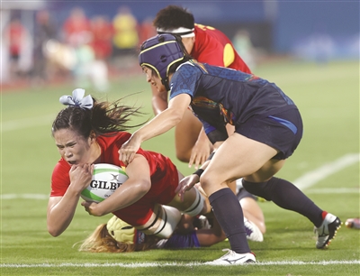 9月26日,中国队球员周燕(下左)在比赛中达阵得分。 当日,在七人制橄榄球女子决赛中,中国队以22比21战胜日本队,夺得冠军。新华社记者 贾浩成 摄 |
