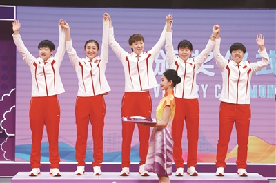 当日,在乒乓球项目女子团体决赛中,中国队以3比0战胜日本队,夺得冠军。 新华社记者 刘续 摄 |