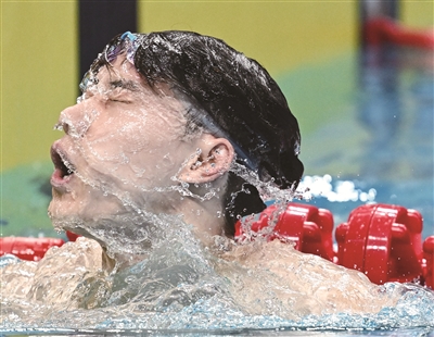 9月25日,覃海洋在决赛后。 当日,在游泳项目男子100米蛙泳决赛中,覃海洋以57秒76的成绩夺得冠军并创造新的亚运会纪录。新华社记者 夏一方 摄 |