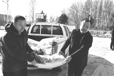 近日,通榆县同济堂医院院长李徳伟(右)来到通榆县向海蒙古族乡回民村和复兴村,给这两个村的养老大院孝老餐厅捐赠价值七千余元的40袋大米和20袋白面,让生活在这两个村的40多位老人,感受到来自社会各界的关爱和温暖。陈宝林 摄