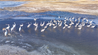 近日,珍稀鸟类白鹤、灰鹤等飞到洮南市安定镇四海湖国家湿地公园栖息、觅食,待“集合”后迁徙到南方过冬。邱会宁 范海辉 摄