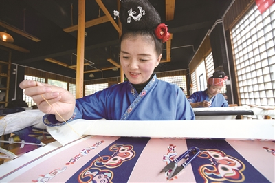 近年来,贵州省黔东南苗族侗族自治州施秉县不断培育和打造苗族刺绣特色产业,引进特色民族文化加工企业,形成集“研、产、销”和旅游观光于一体的苗族刺绣产业链,并采取“公司+实训+农户”的模式,实现线上线下销售,2000余名苗族妇女在家门口就业增收。同时,施秉县还不断加强非遗文化的传承,让当地的孩子们从小接触这一传统技艺,使大山里的“非遗”焕发出新的生机。新华社记者 杨楹 摄
