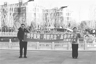近日,中汇人寿保险股份有限公司白城中心支公司组织开展了防范非法集资宣传教育活动。活动通过“线上+线下”等方式同步开展,向广大消费者警示非法集资的形式特点与危害,切实帮助消费者维护自身合法权益不受侵害。图为工作人员在白城市秋实园宣传防范非法集资活动。刘旭东 摄
