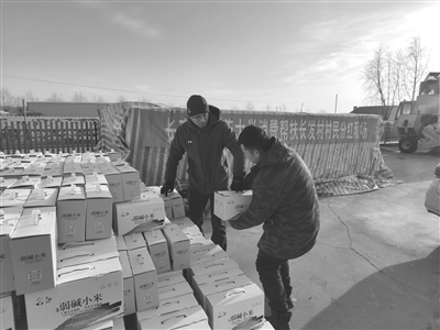 近日,长春中医药大学订单式采购通揄县兴隆山镇长发村志安种植专业合作社“老臧头”弱碱小米、五谷杂粮8万余斤,为包保帮扶的长发村在籍村民506户免费发放1012箱弱碱小米礼盒,精准实施消费帮扶。图为驻村工作队员正在为村民分发礼盒。 陈宝林 刘晓华 摄