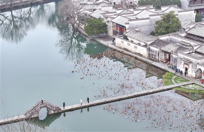 12月19日在安徽省黄山市黟县宏村拍摄的雪景(无人机照片)。近日,多地迎来降温降雪。雪后的大地银装素裹,美如画卷。新华社发 施亚磊 摄